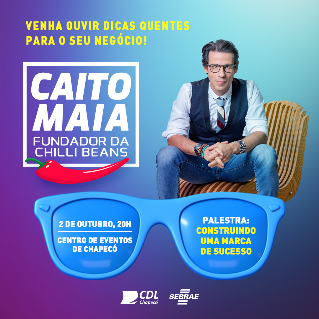Caito Maia costuma fazer a plateia enxergar novas dicas e perspectivas sobre produtos, comunicação, estratégias de marketing, vendas, posicionamento e expansão de marca. O público presente conhecerá sua história de vida e a trajetória da Chilli Beans até o topo. “Essa é uma oportunidade de aprender com um expert em negócios e marketing, que proporcionará insights para negócios inovadores ou para quem deseja reinventar sua marca”, comenta o gerente regional do Sebrae/SC no oeste, Udo Martin Trennepohl.